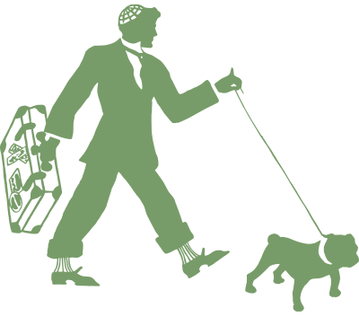 - man dog walking walk suitcase travel male leash silhouette green vintage retro 1910 pitbull dog walking