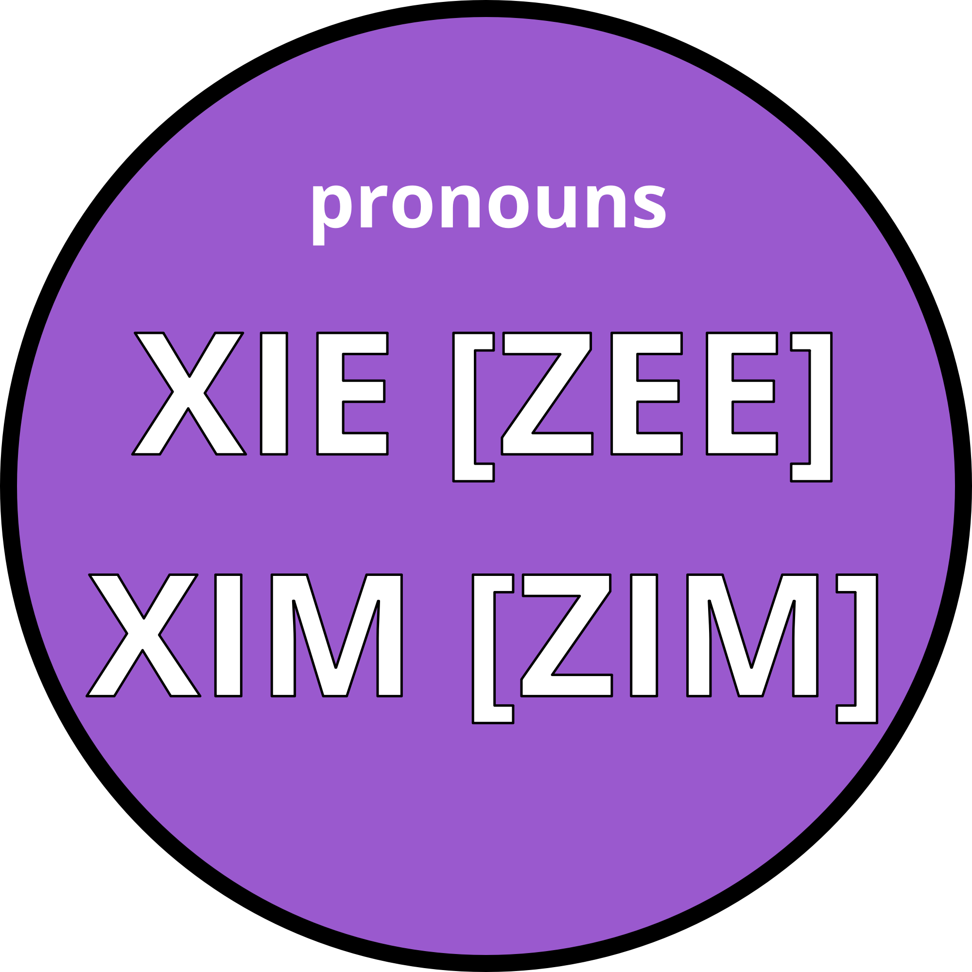Xie / xim non-binary pronouns round purple badge with pronunciation xie ("zee") and xim ("zim"). See also https://openclipart.org/detail/345240/lgbt-pride-pronouns-badge-square-for-gender-identity-inclusion
