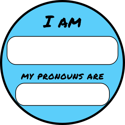 My name is and my pronouns are custom/write-on badge in the transgender pride flag shade of blue. Putting pronouns on a badge or announcing your name and pronouns together helps give an inclusive environment for non-binary and transgender people whose pronouns may not be obvious.