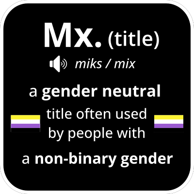 Black rounded square saying "My title is Mx", for people on the nonbinary gender identity spectrum. With pronunciation and nonbinary pride flag.