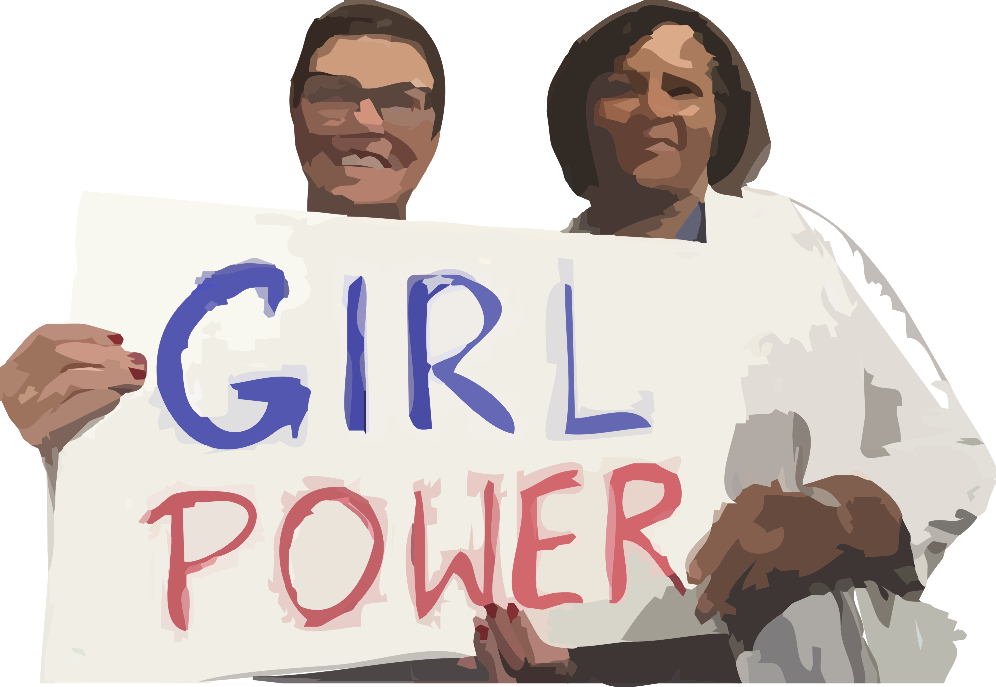 Two women, one Black and one White holding a homemade Girl Power sign during an anti-Trump protest. Linearly curve removed the crowd background.