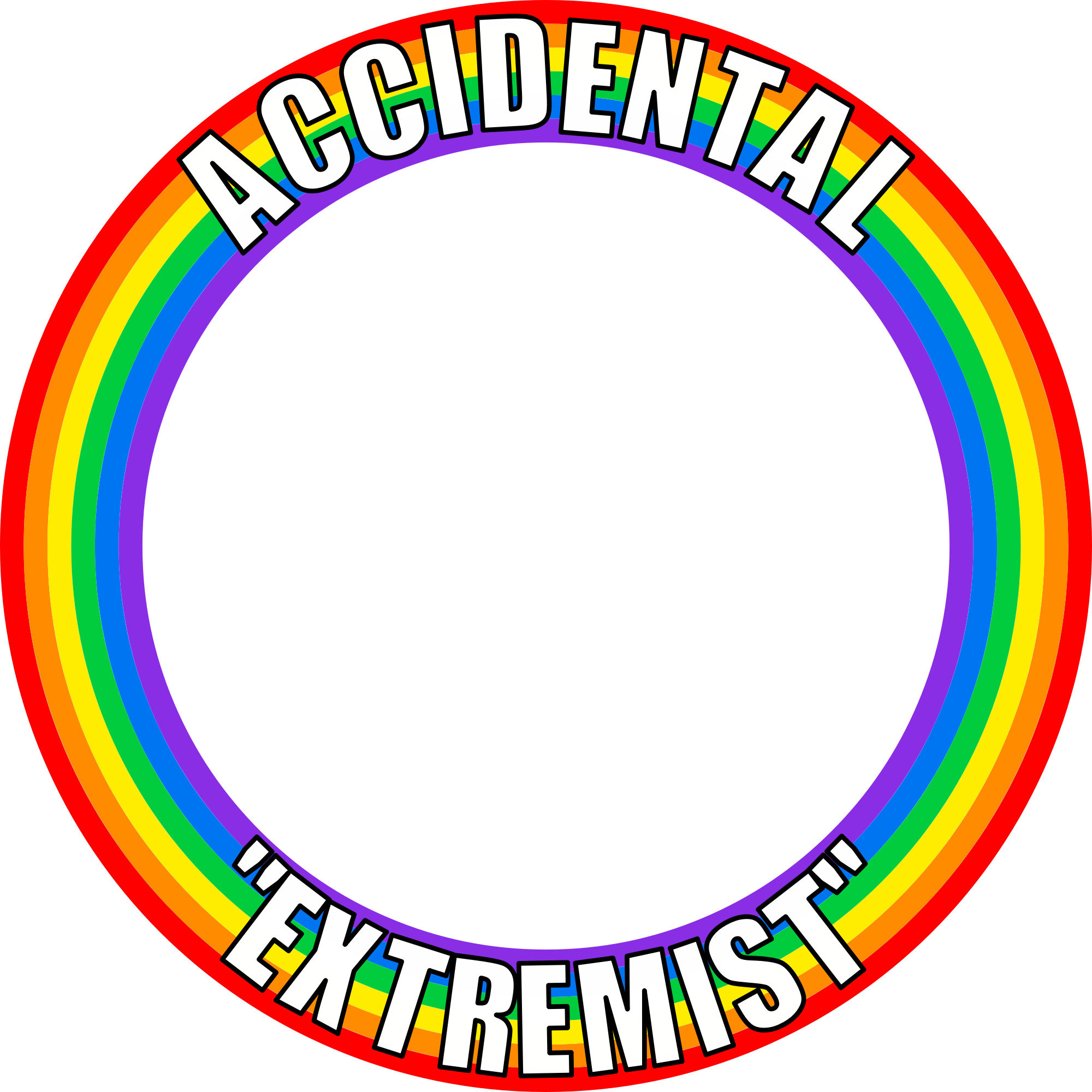 LGBT+ pride round frame with the words "accidental extremist", reflecting Putin declaration LGBT rights an "extremist" movement