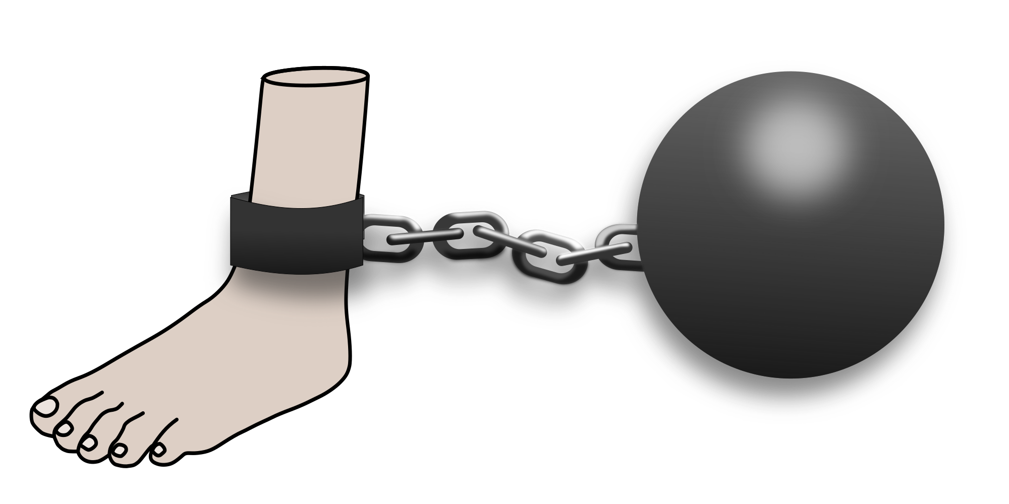 a leg bound to a ball and chain; symbolic of not being able to escape, being held to something by a weight
