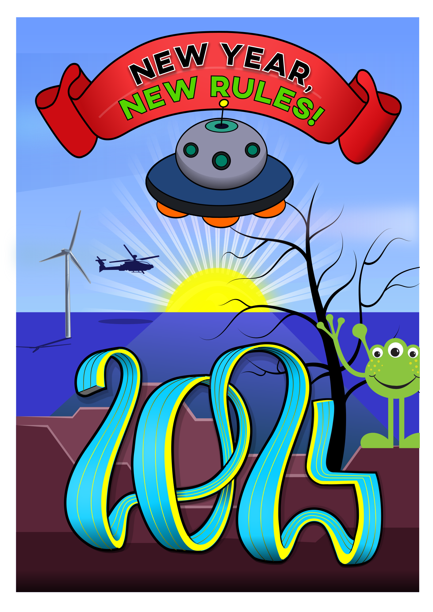 - 2024 typography 3D ribbon New year change UFO sea sun remix+346215
