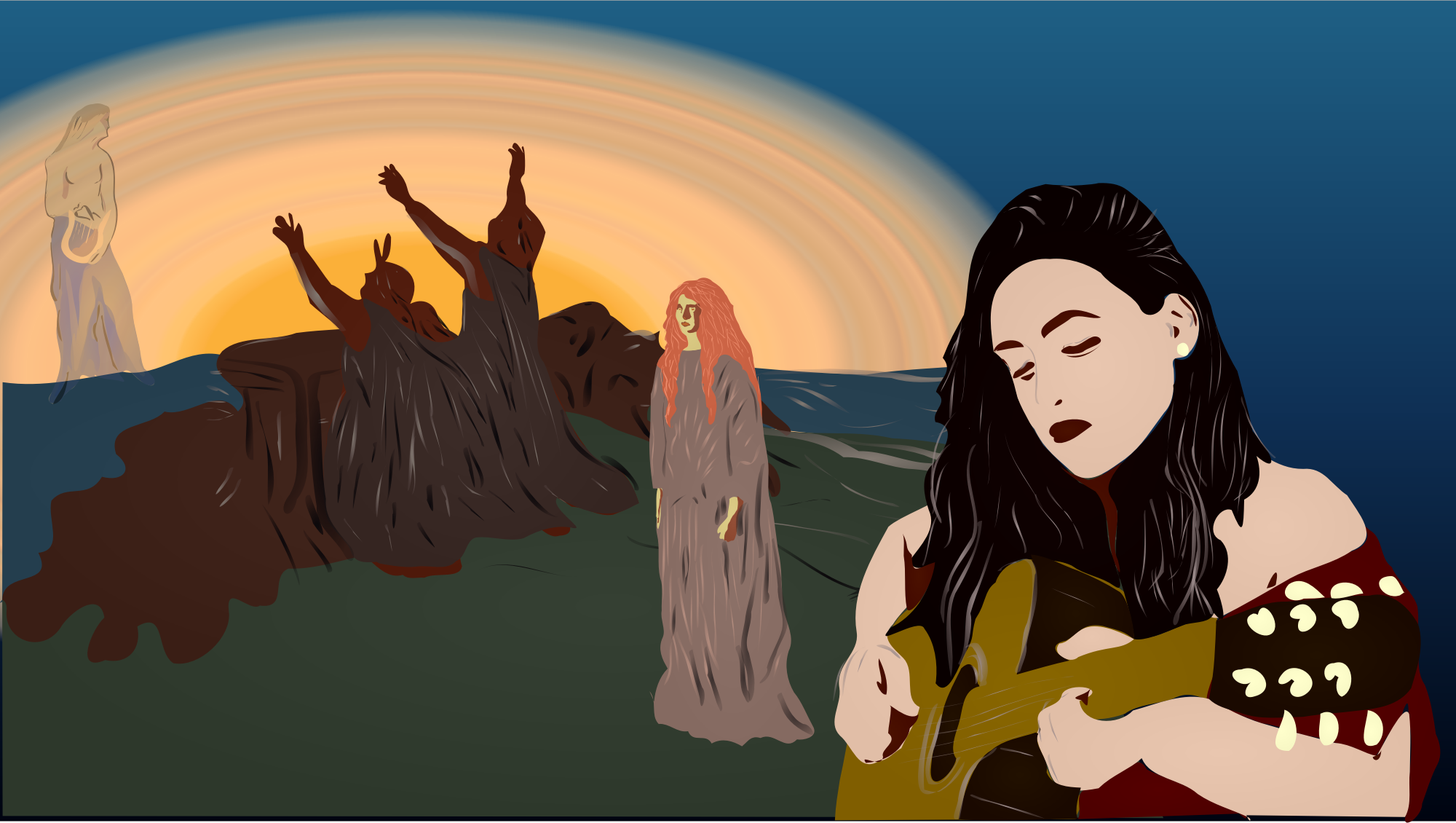 I have been looking for images of Brighid and found one but i had to reimagine it a bit. This is a combination of three images -commons.wikimedia.org/wiki/File:A_Celtic_Goddess_Holding_a_Lute_-_George_William_Russell.png, File:The_Passing_of_St._Brighid.jpg, File:Monochrome_girl_plays_guitar_(Unsplash).jpg - from three time periods and styles. but i munged them together to try to tell a story.
