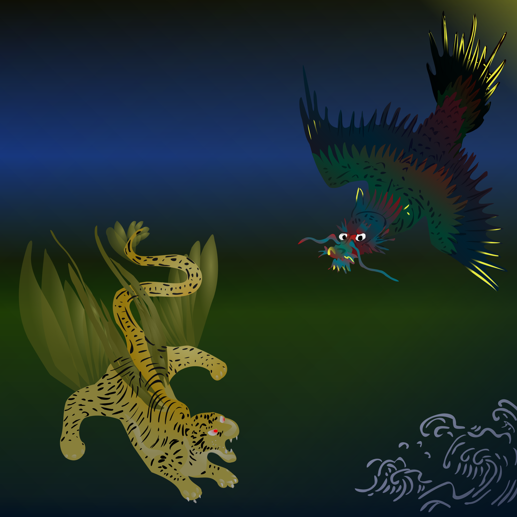 so carl sagan wrote 'dragons of eden' and 'deciphered' dragons - combinations of tigers and snakes, our early predators. dragon comes from the word 'to see' because snakes dont blink and cats' eyes are mystical... also the root of wisdom - why dragons are 'wise'. dont know where the wings come from... anyway, i am responsible for the framing and the feathers on the tiger who was called a dragon by the artist....