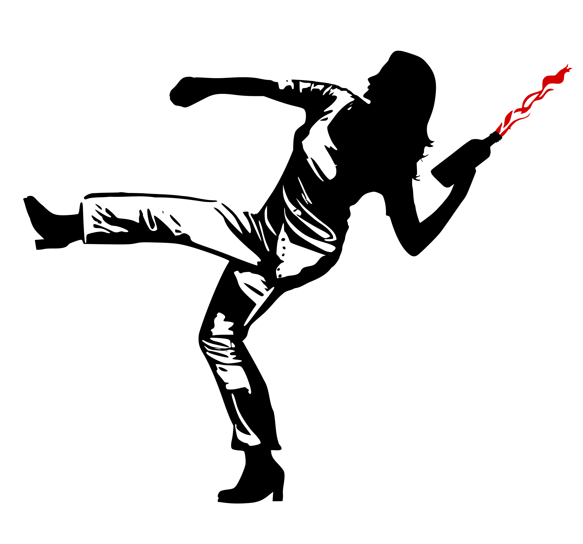silhouette of a female protester throwing a Molotov cocktail with a red flame