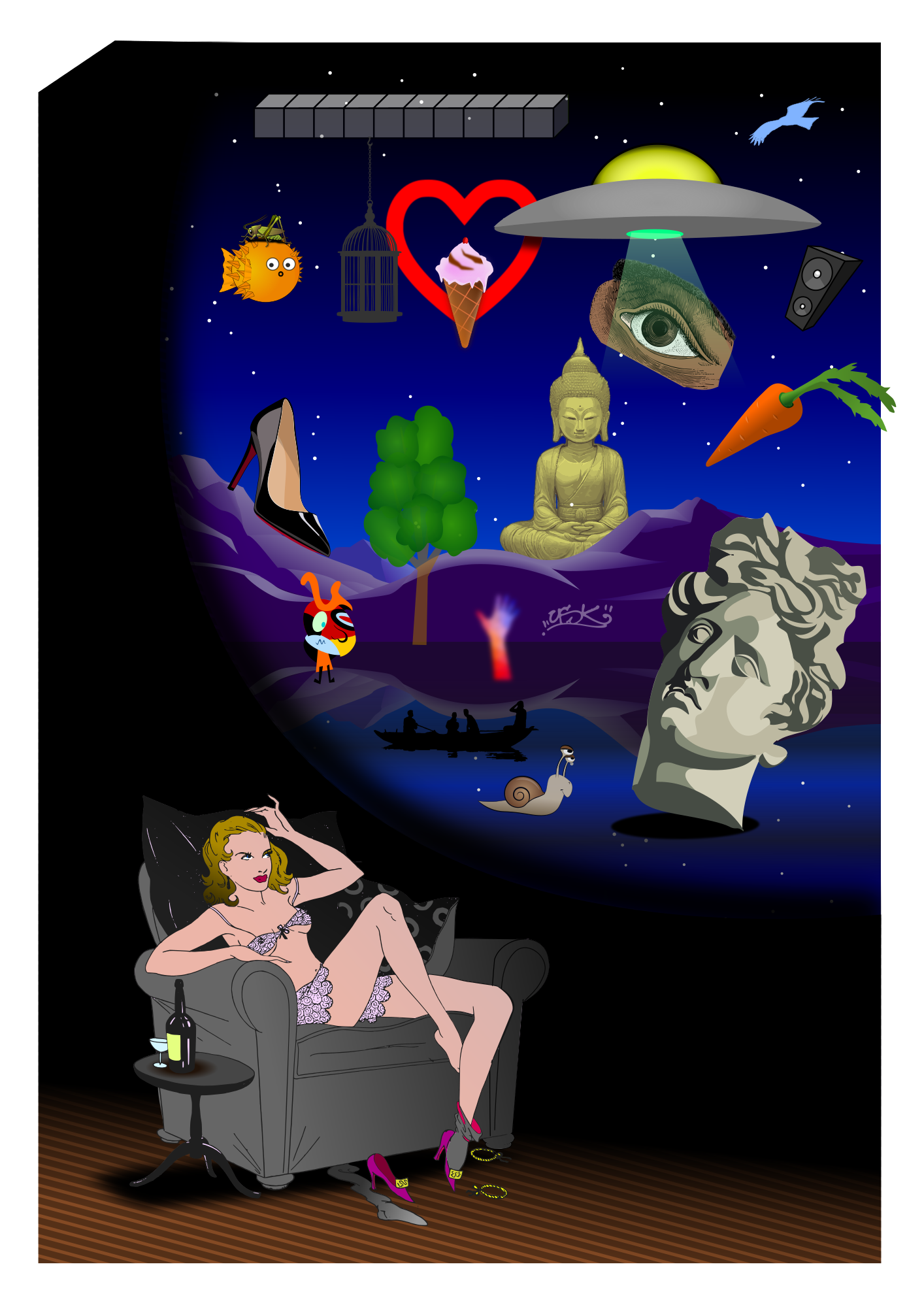 - remix+272915 remix+346894 remix+338159 delirium dream Armchair alcohol bottle wine reflection ramble bubble mind strange night stars alien de chirico surreal surréalisme surrealism remix+341625 drunk
