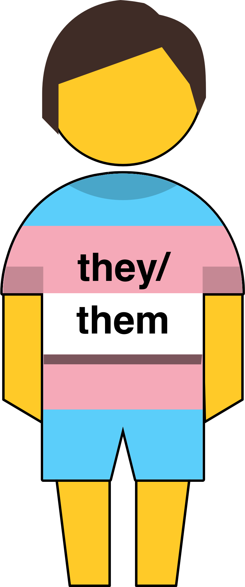 Child wearing a T-shirt and shorts in transgender flag colors, with "they/them" pronouns on the T-shirt. The yellow emoji of the child has fairly short brown hair and no facial expression.
