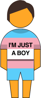 Transgender pre-teen boy symbol with a T-shirt saying "I'm just a boy". The emoji is orange with short dark hair and no facial expression.