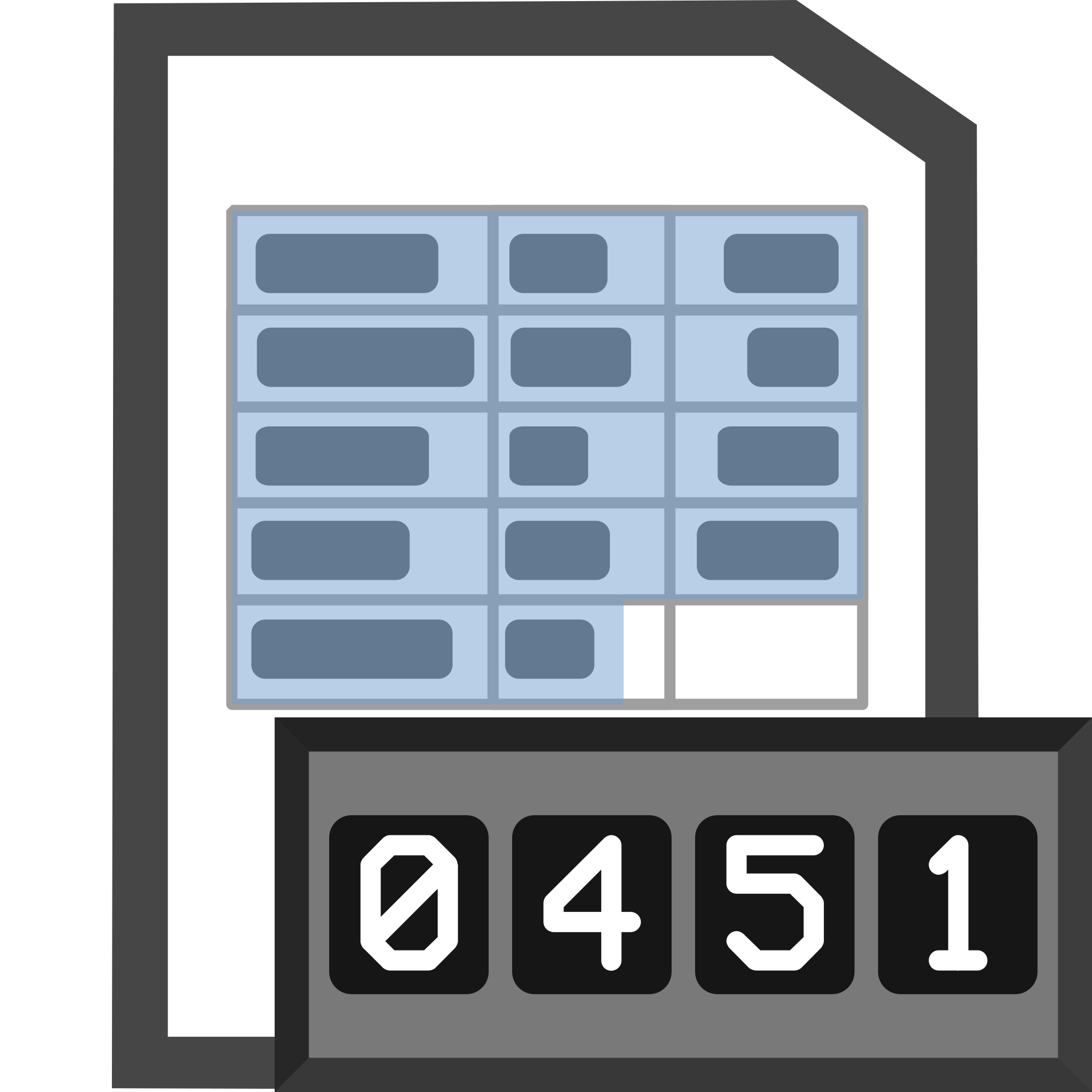A csv, excel or other formatted text format sheet document file with all text selected and a counter in the bottom right corner. Generic grey style. Number should be editable after deleting the baked text group above.
