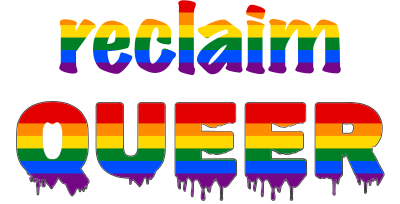 Reclaim queer in pride colors with queer in a graffiti paint effect font with paint dripping.