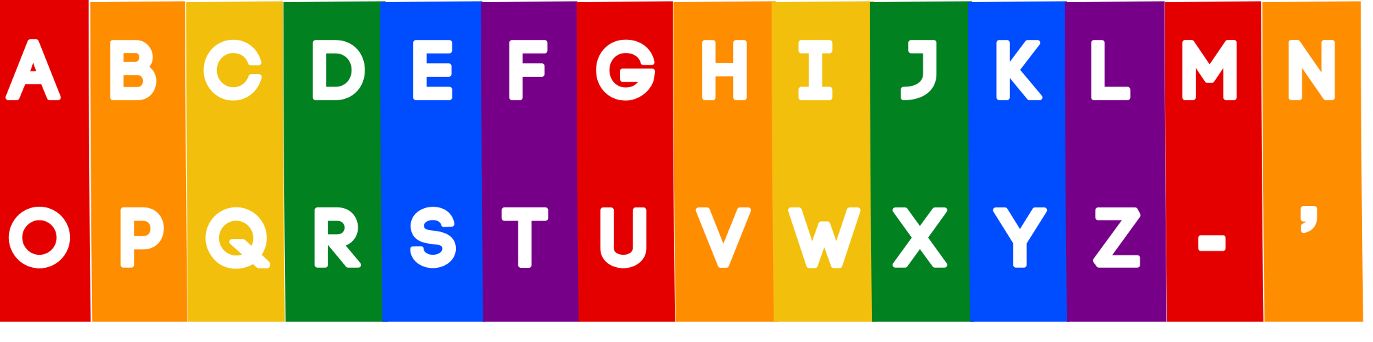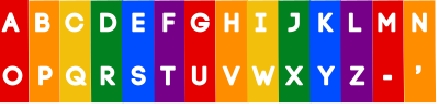 Alphabet with hypen and apostrophe in upper case text in white with alternating rainbow / LGBT pride flag colors behind. Reversed Impact is the font. The yellow has been made darker/slightly more orange to improve constrast against the white letter.