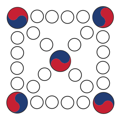 Yutnori is a traditional Korean board game; it is played with thrown sticks instead of dice, but this is just the board game. Printable if you wanted to do that. (No requirement for the Korean flag swirls, that's just a design flourish of course.)