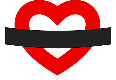 A white heart with a very thick red outline and a thick black curved banner across the middle, in a similar sign to the famous London underground roundels.