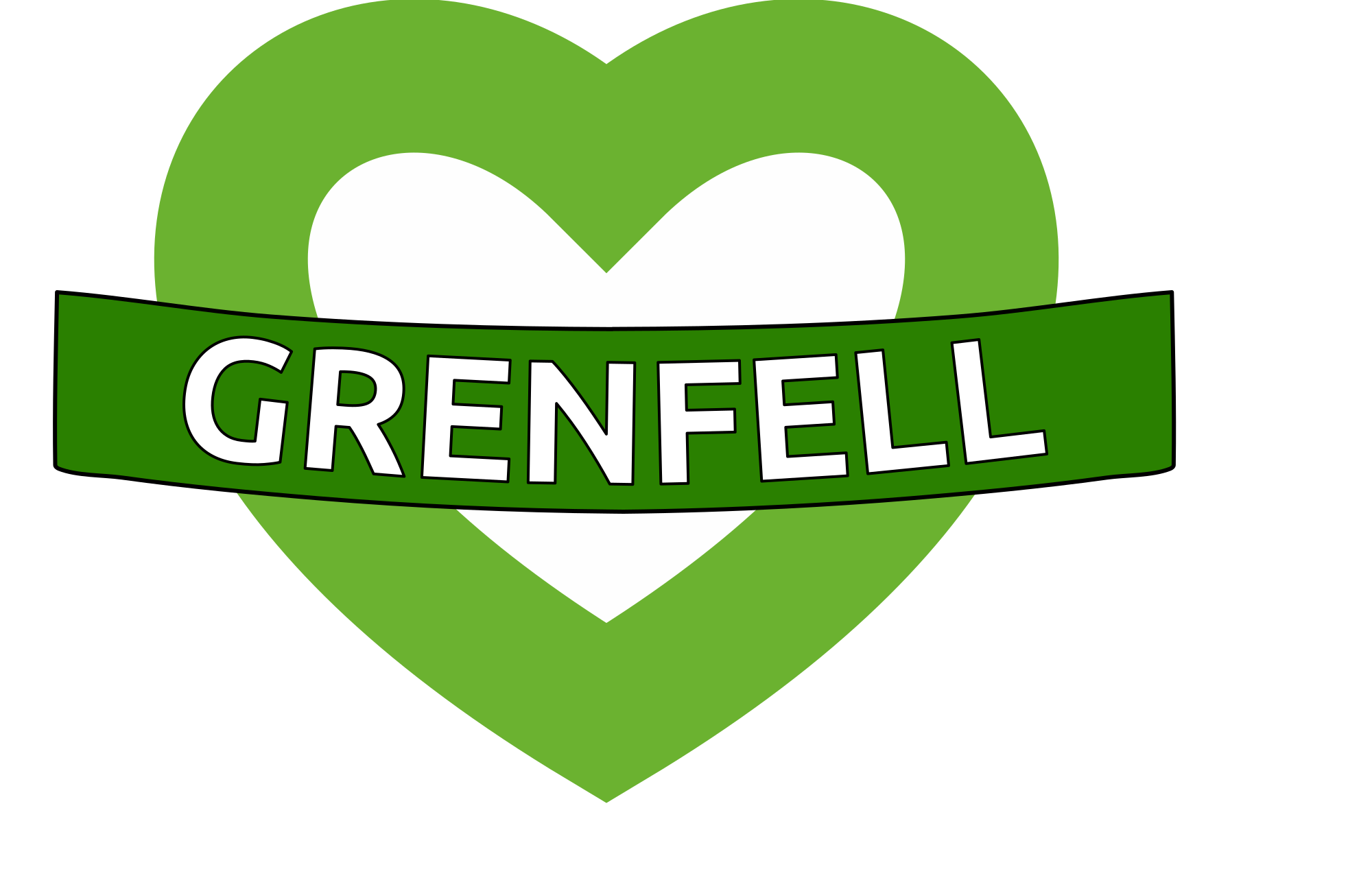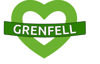 Green for Grenfell logo - white heart with light green thick outline, and darker green banner across the middle saying Grenfell. In memory of victims and survivors of the Grenfell Tower fire in 2014, and their loved ones. Not sure who originally came up with the design.