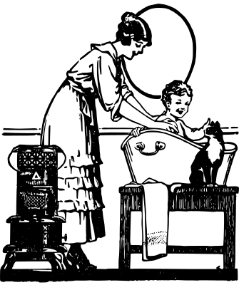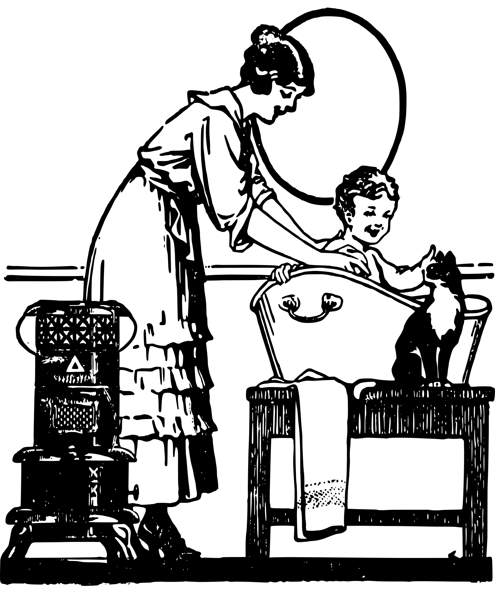 a mother bathing her kid while a cat watches