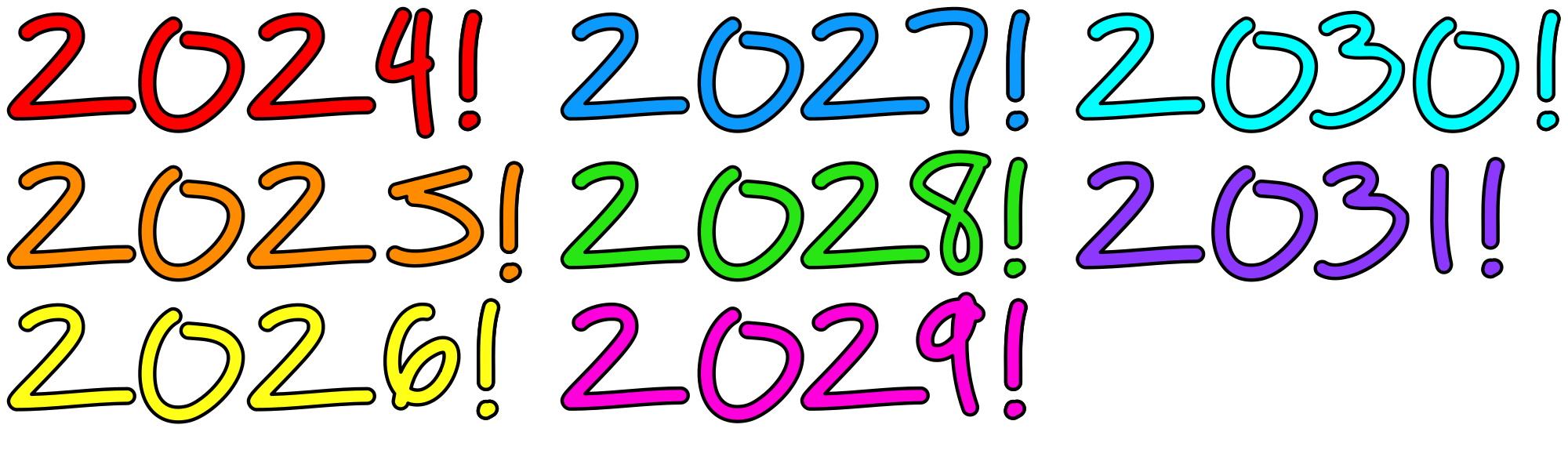 Years 2024 to 2031 with exclamation mark in cyan in bojarksi font by UpandIt with all digits increased using 8pt outline, then outlined again in black. A few digits resized (1, 3, etc) to normalise height a bit more. Rainbow colors plus cyan.
