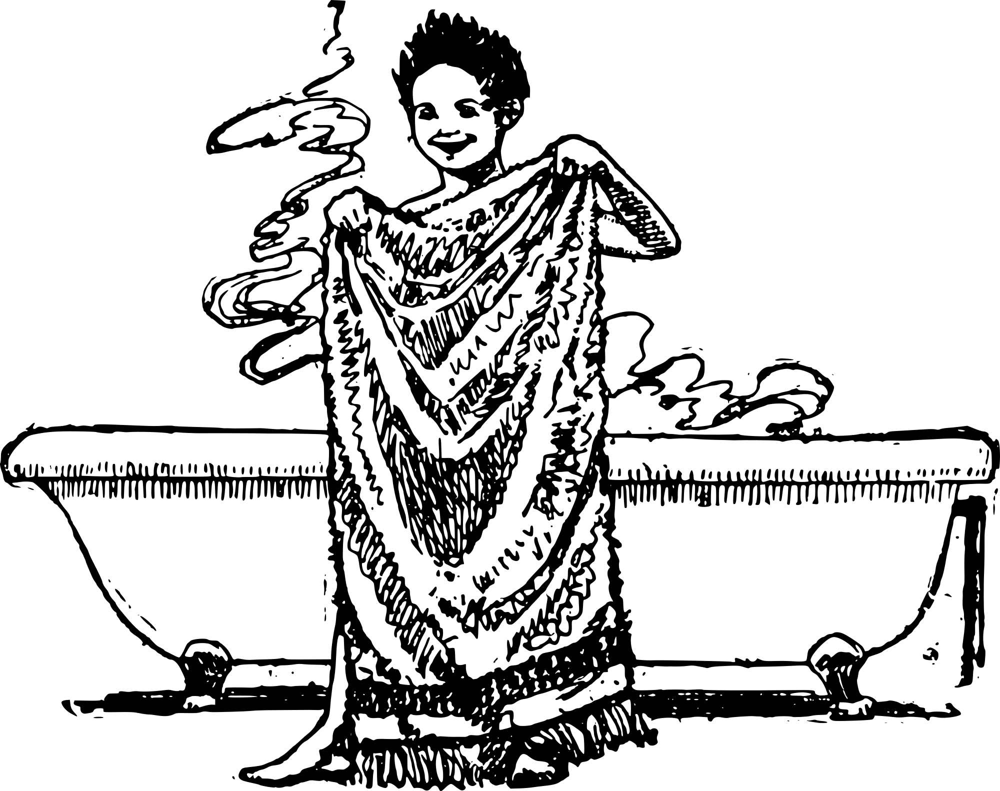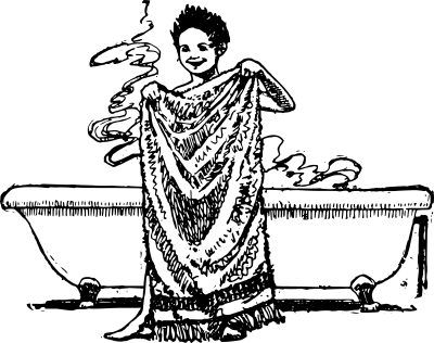 a boy with a big bath towel getting out of a classic bath tub... I wonder if one could build a huge wall of air blowers into a bathroom so you wouldn't ever need a towel...?! that'd be cool