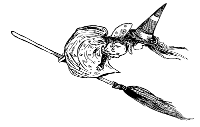 Here, the witch is upside down on her broom, which is therefore right-side up (according to the current trend). She just looks back.