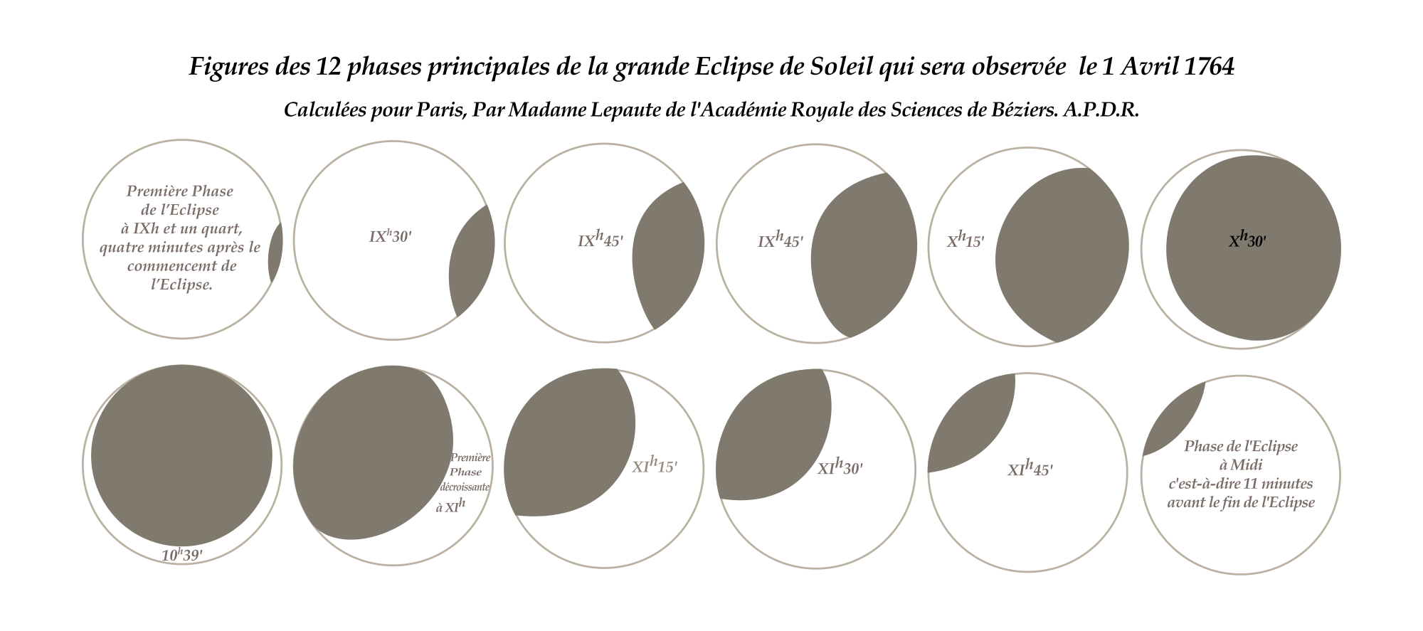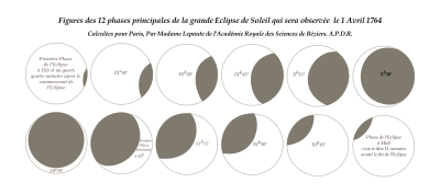 Figures des 12 phases principales de l'éclipse de soleil calculées pour Paris en 1764 par Nicole-Reine Lepaute de l'Académie royale des sciences de Béziers. Dessin à partir de l'original que l'on peut trouver à la BnF Gallica :