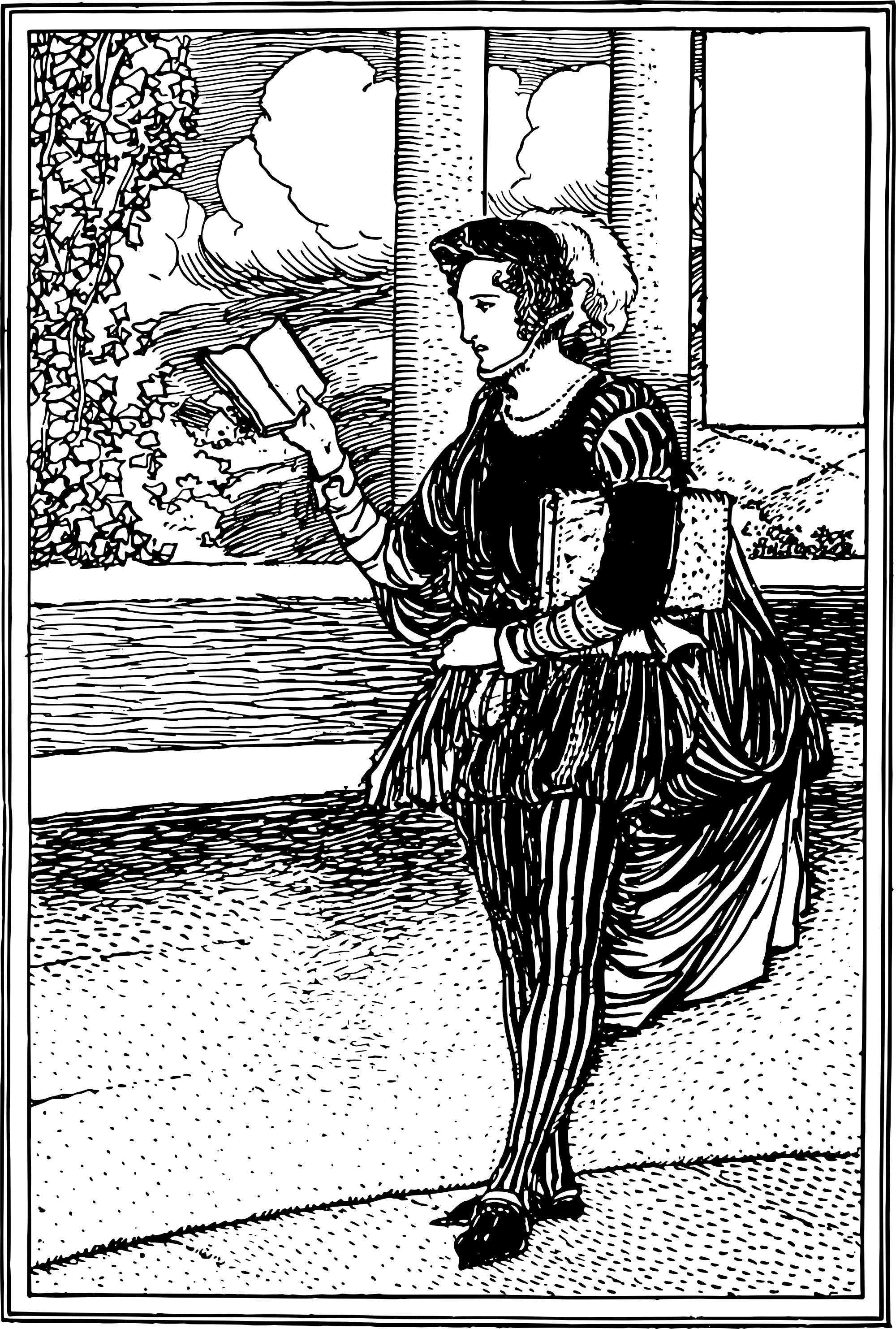 this man is reading and standing (something I never do) in a location with a good nature view