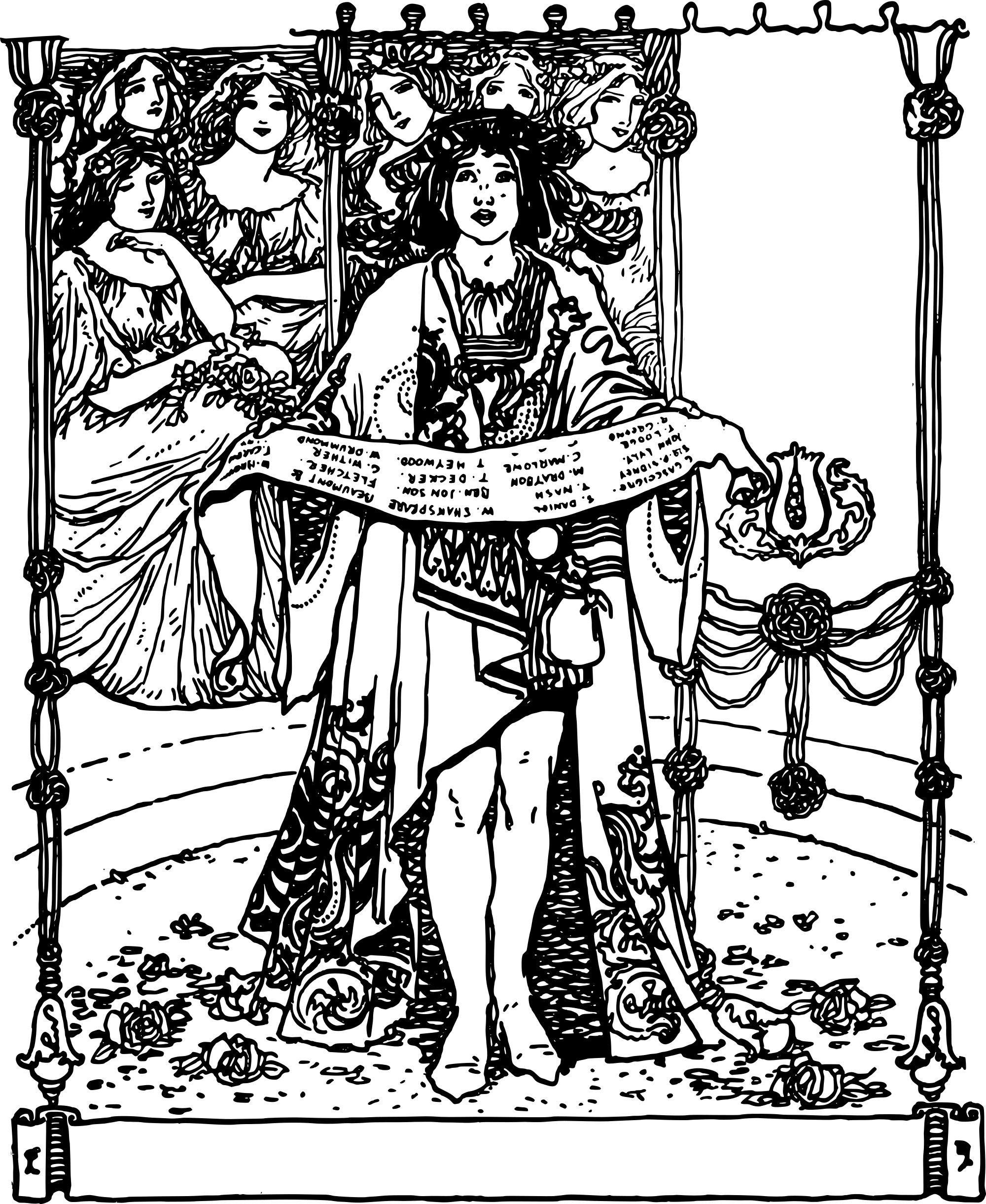 a vintage depiction of a man reading while women watch him