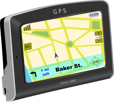A GPS (satnav) device displaying a fictitious map. Drawn in Inkscape.
