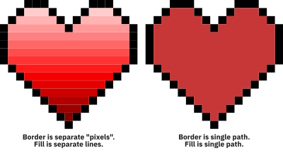 A pair of pixel art hearts. One has an outline made of individual 18x18 "pixel" squares and individual lines. The other has an outline made of a single path, and a fill made of a single path.