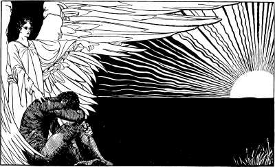 An illustration from 1906 of a sorrowful figure hunched in despair, comforted by a serene angel with large, flowing wings.
