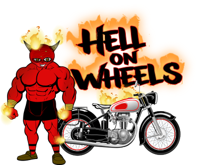 text that says "hell on wheels" next to a flaming bicycle and a male horned demon