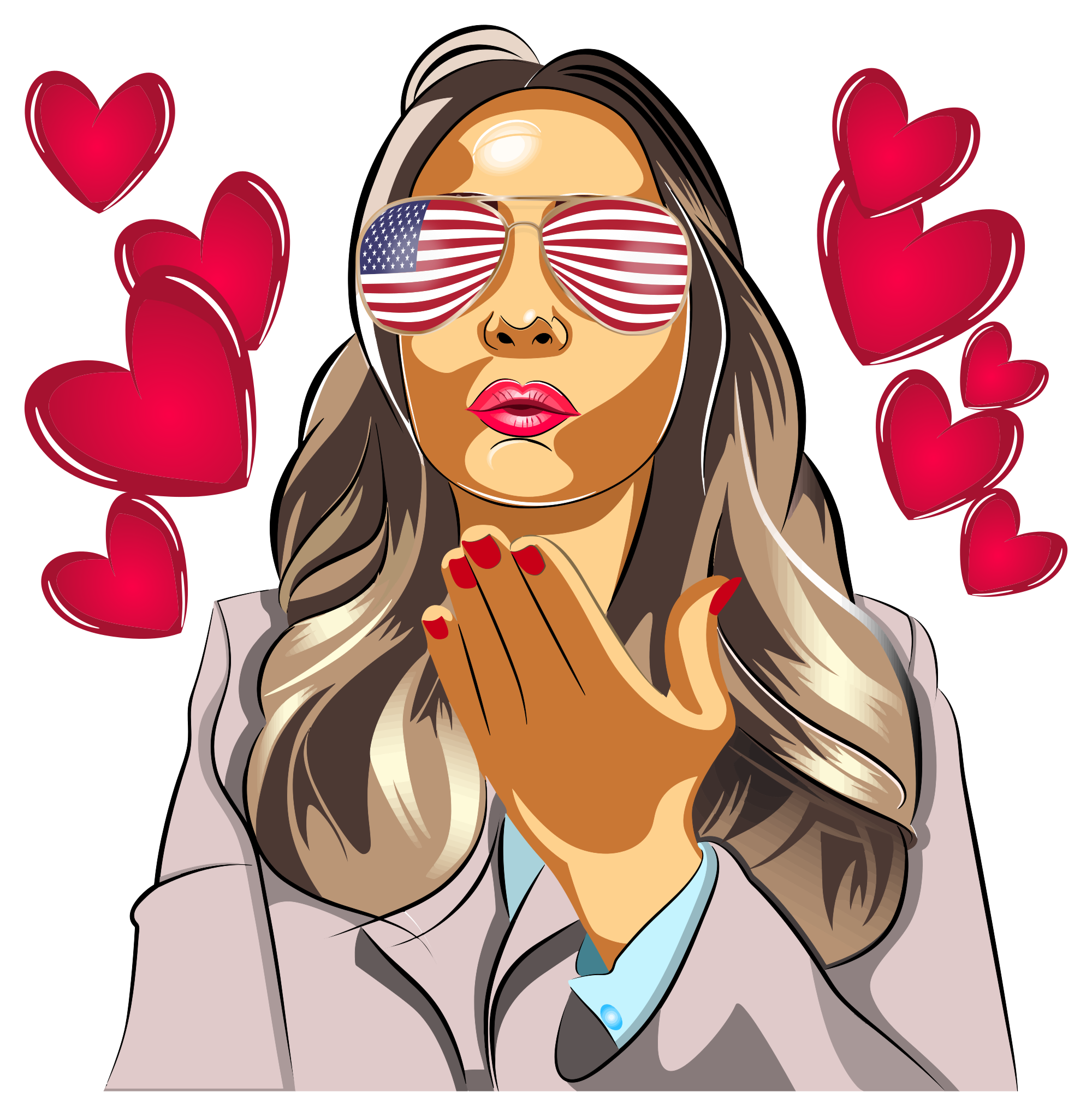 a lady blowing a kiss while wearing big bold American flag sunglasses