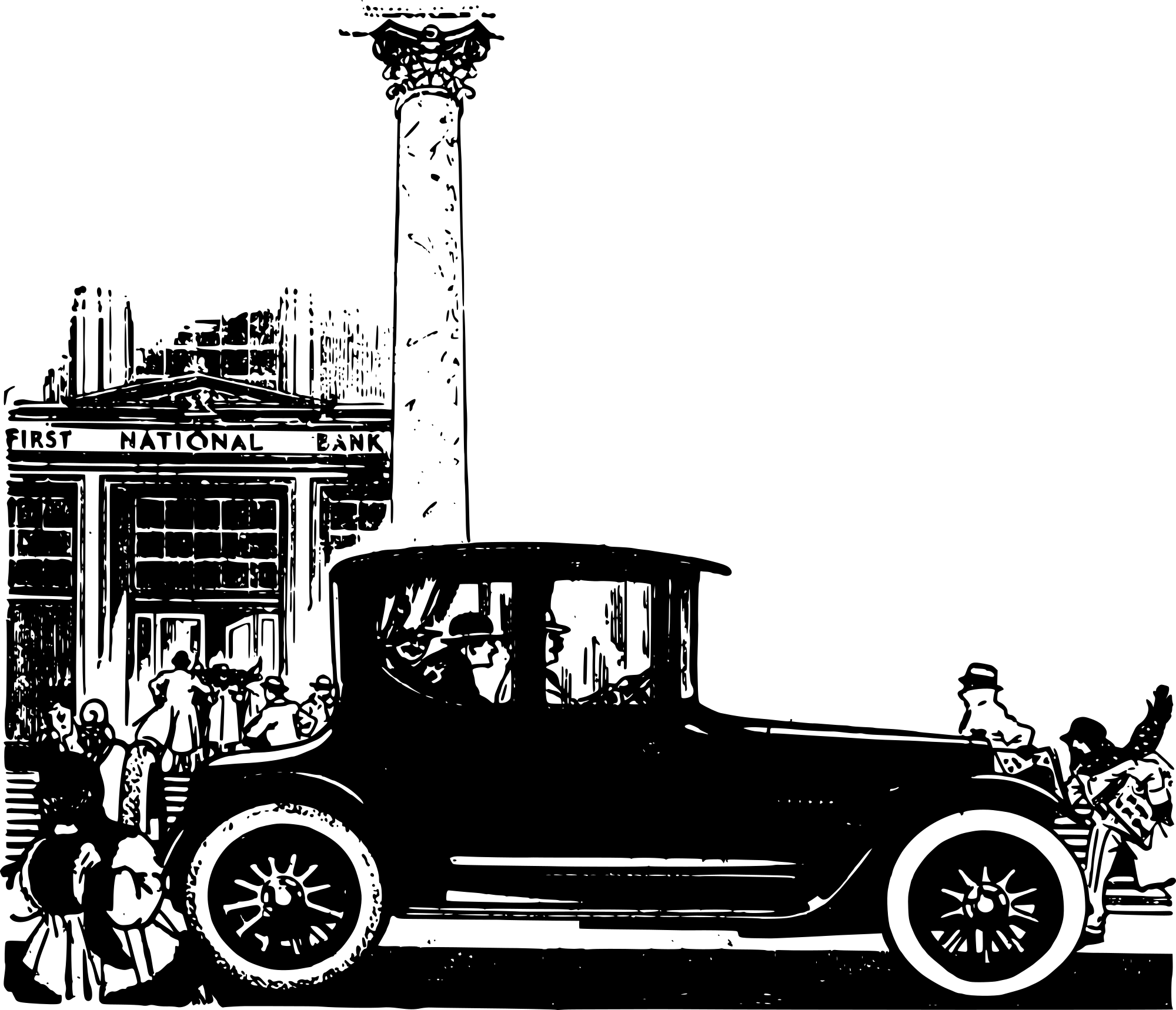 a classic car in front of a bank