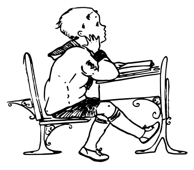 a boy sitting at a classic school desk