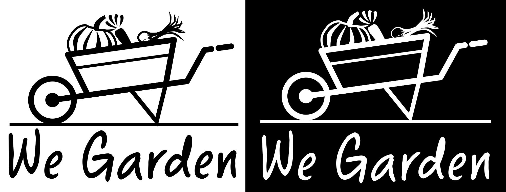 Stylized wheelbarrow loaded with vegetables with "We Garden" below
