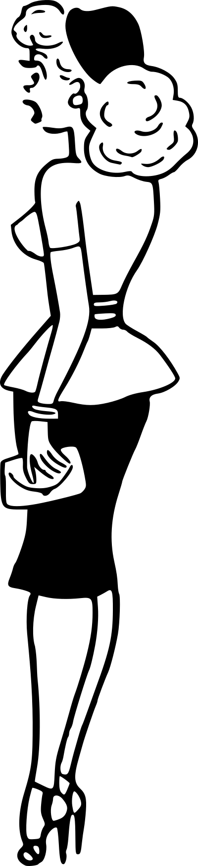 - retro woman comics 1950s comic cartoon drawing black and white high heels skirt pompadour hat earring wallet bracelet lipstick back 1954