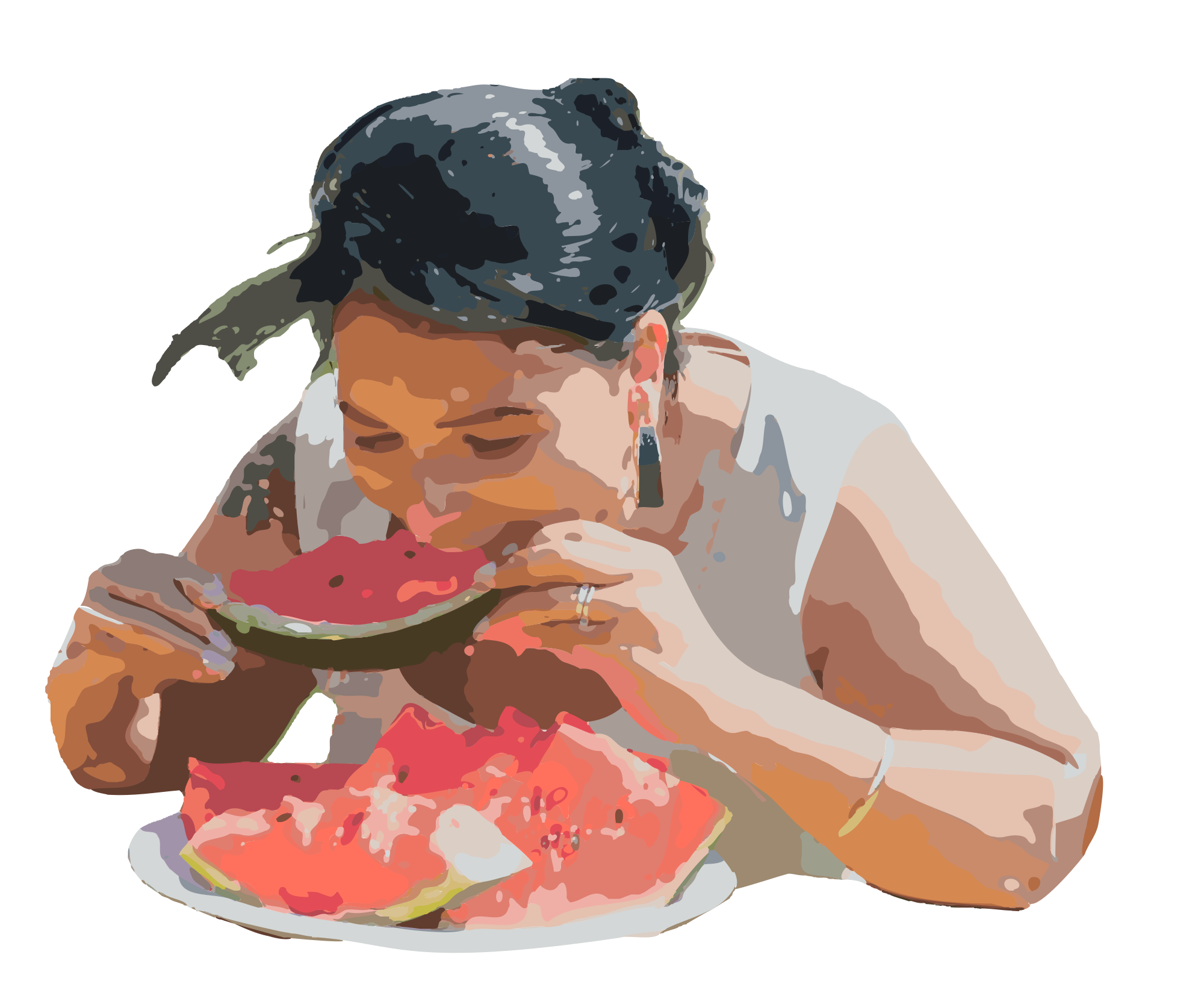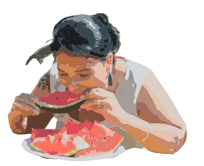 A lady taking a big bite out of a watermelon slice (based on a public domain photo released by the United States Navy)