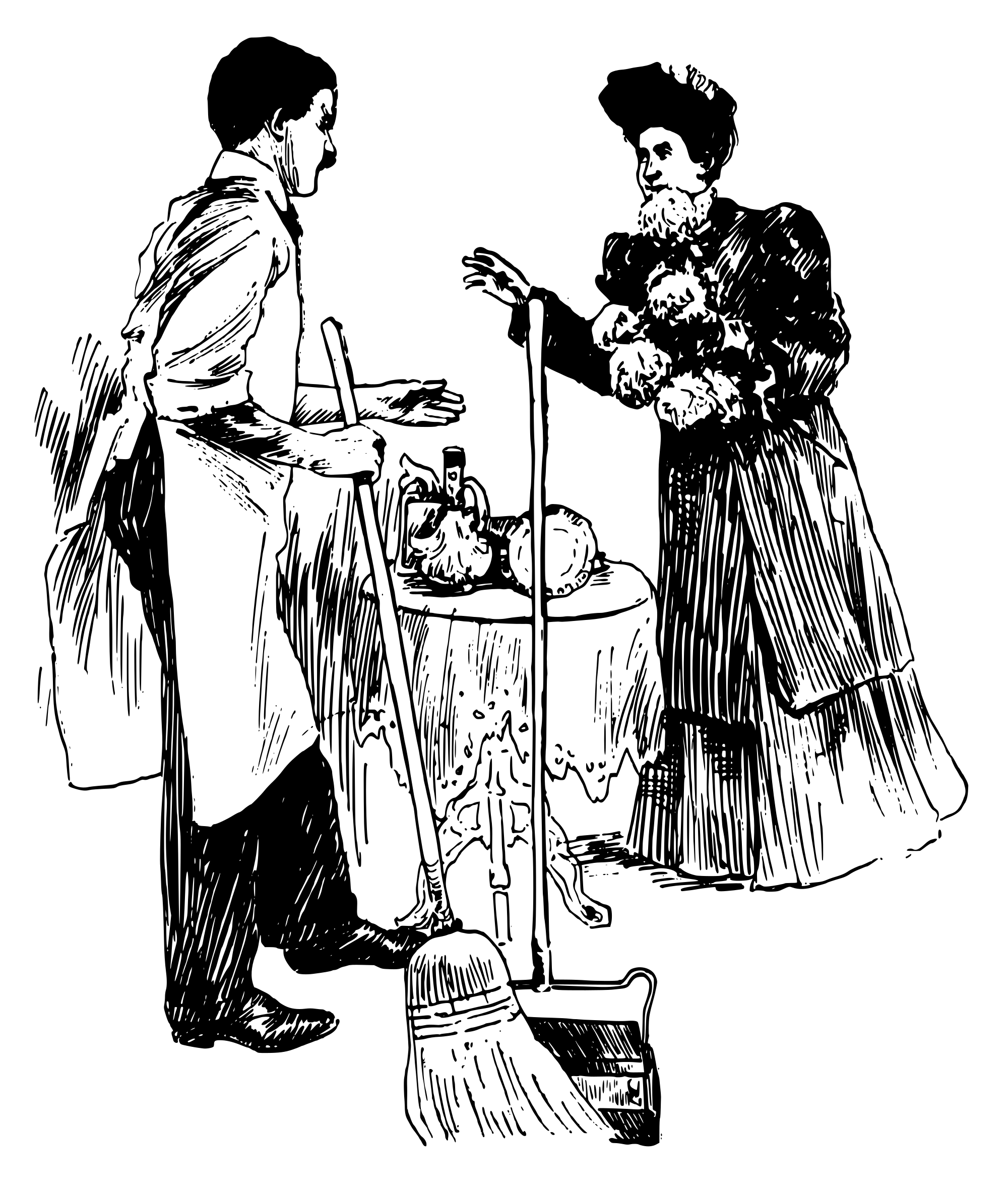 a man sweeping up the house while talking to his wife who is on the way out