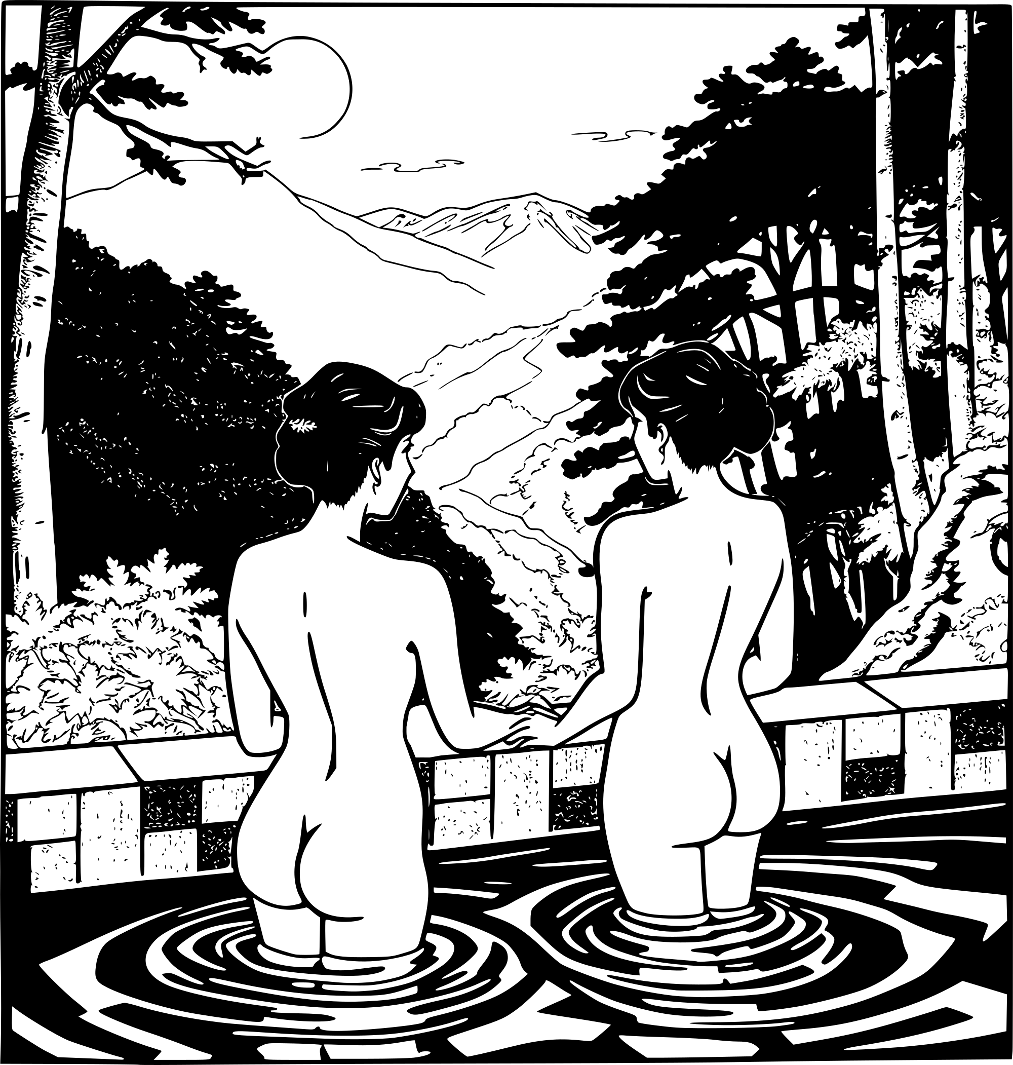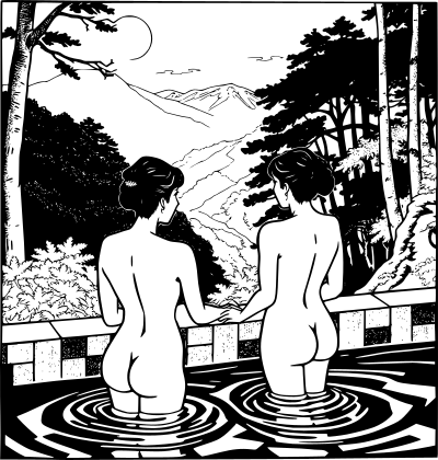 - bathing onsen hot springs Japan Japanese relaxing ai_art forest nature rear bum nude two women bathe