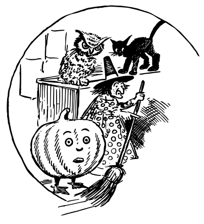 a witch gathered with some of her friends: an owl, jack-o-lantern and a black cat