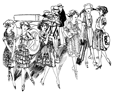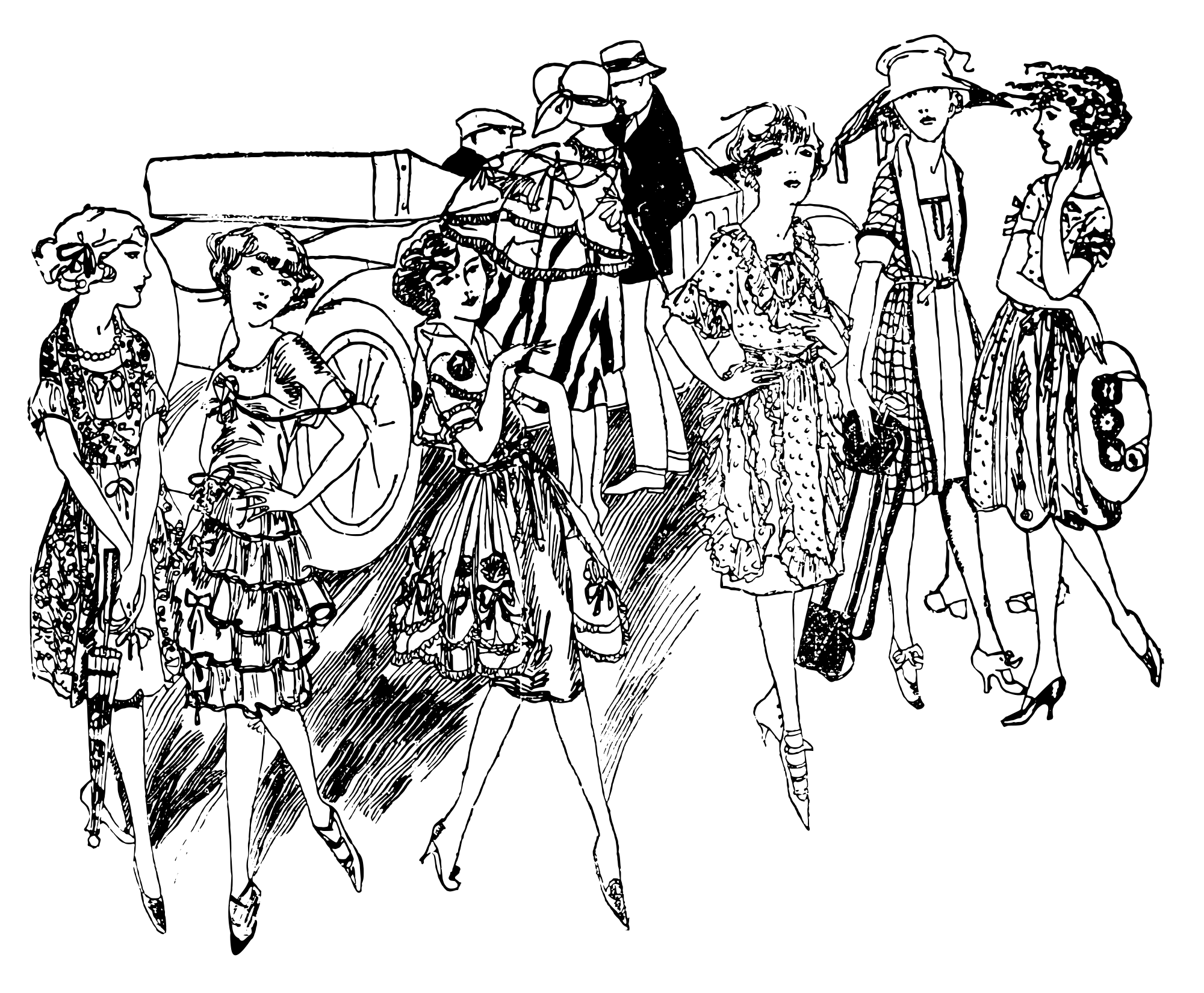 six young ladies posing in front of a car and some people