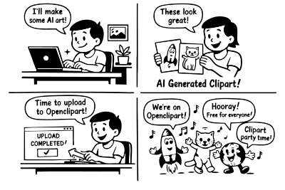 This is a sickeningly cringe January 2026 result of the ChatGPT 5.2 prompt "Make a 4 panel black and white cartoon that praises the uploading of ai generated art to openclipart with a comedic twist; black and white flat style, only copying public domain sources, to be traced to svg and uploaded to openclipart later." - Then traced in Adobe Illustrator and minified (to very little effect) in SVGOMG. Fun fact: the generated bitmap image had some color (4th panel cat's nose center was pink, turned black during the tracing).