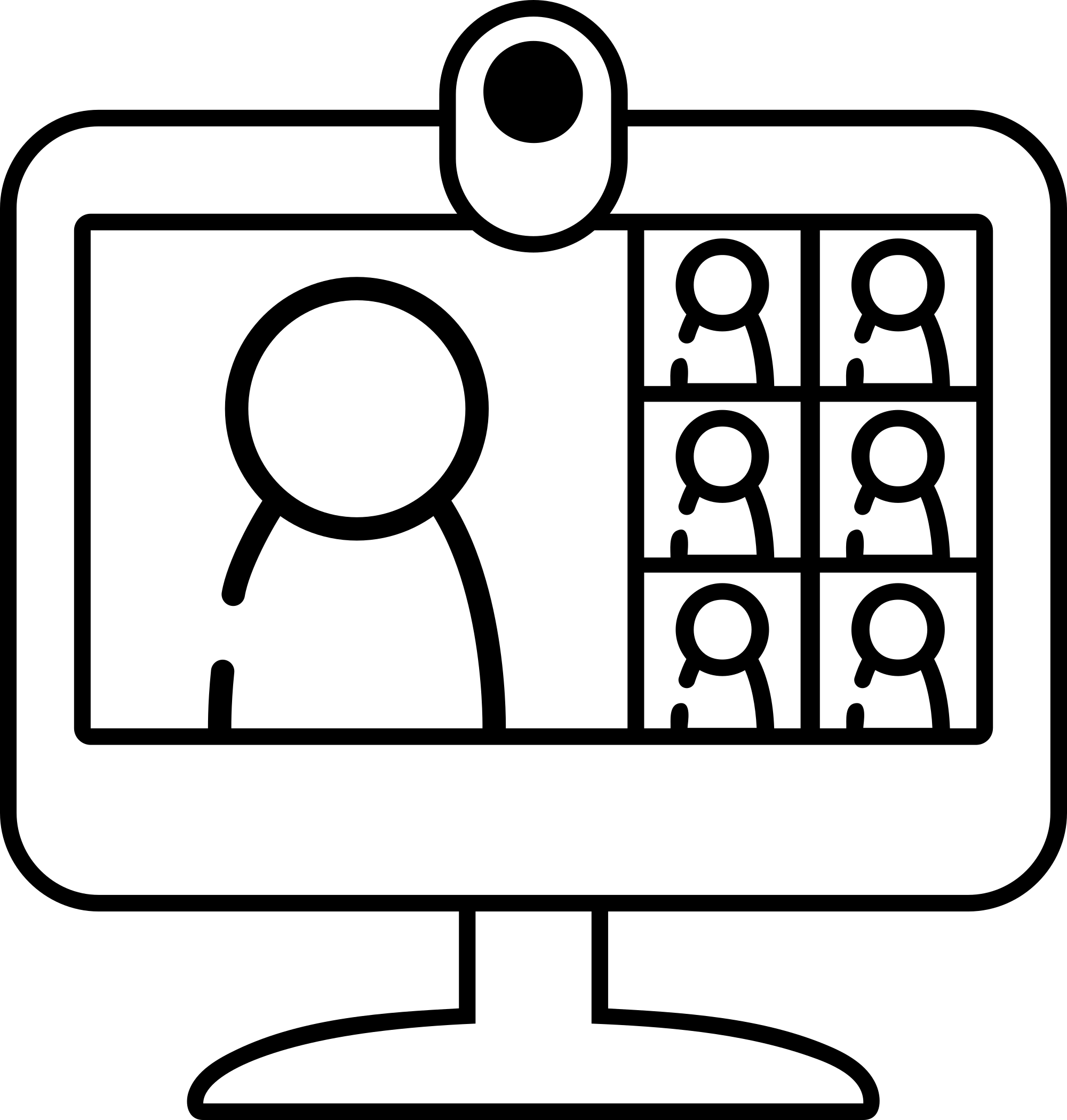 Monitor with webcam and a video chat/meeting software with one person's big feed and 6 people's small feeds. Remix based on https://openclipart.org/354946 Path cleaned up pre-editing using gravitdesign.com's free online tool's Modify/Path/Simplify Path with 1% setting, then edited in Inkscape, then optimized in SVGOMG.