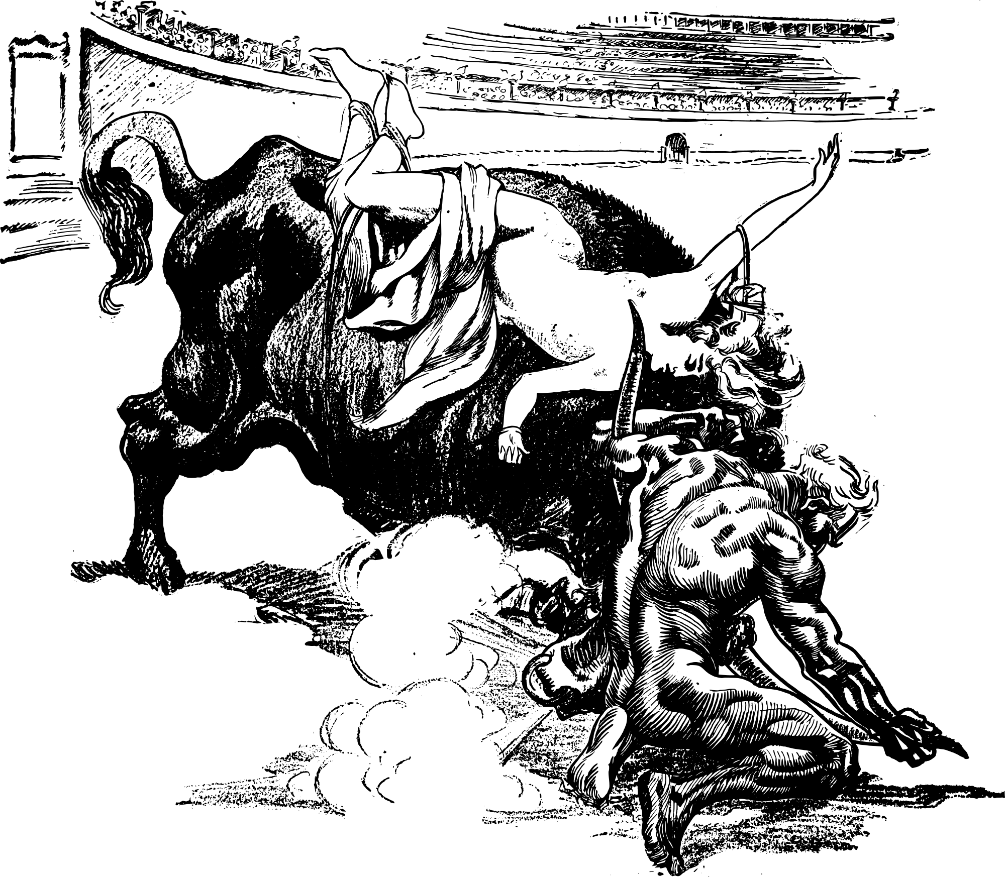 I guess there is some sort of symbolic meaning behind this naked man wrestling a bull with a half naked lady riding on it