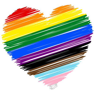 Sketched heart in the colors for Daniel Qasar's LGBTQ progress pride flag, which are: #e40303, #ff8c00, #ffed00, #008026, #004dff, #750787 #000 #613915 #74d7ee #ffafc8 #fff