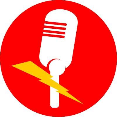 simple red circular icon with white simplified microphone and a small yellow flash