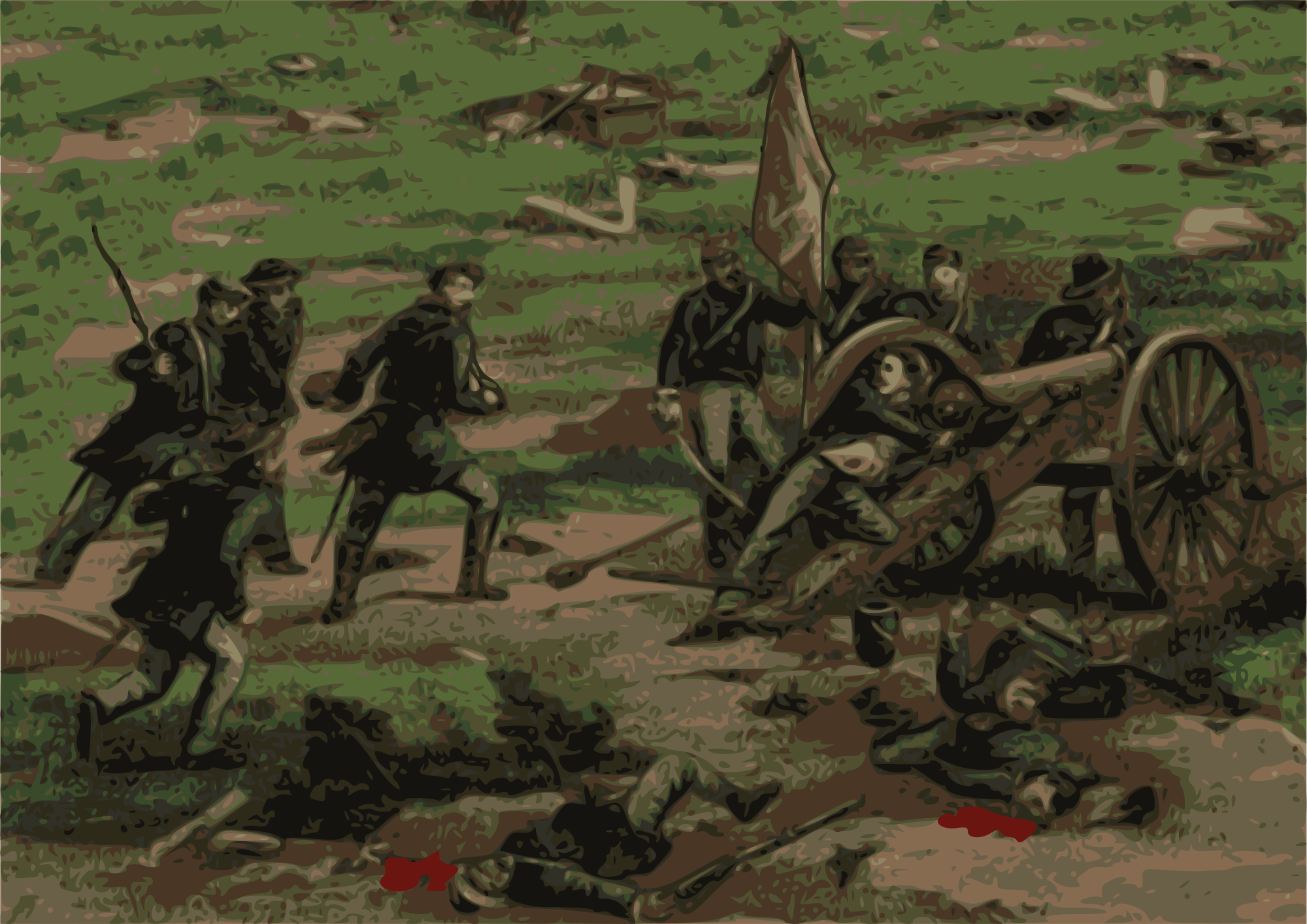 Setting: American Civil War - Characters: Brother versus brother, neighbor versus neighbor, american versus american. For various reasons (get a history book or two and read them if you are interested!) Americans fought each other. This image is intentionally ambiguous to which side it represents, so it can hopefully be used to represent either. Which is symbolic I suppose of a country fighting a war against it's self.