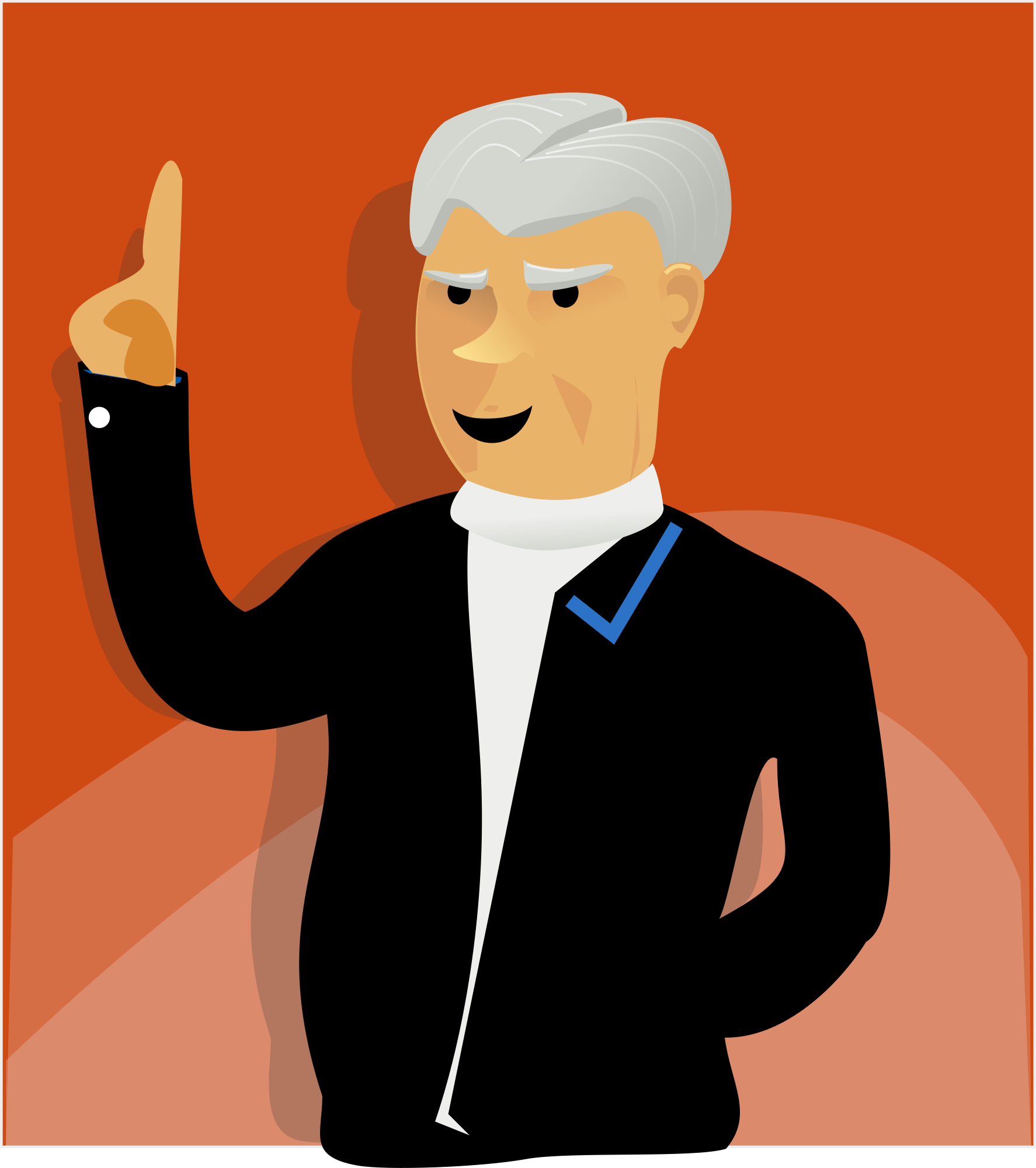 A guy speaking with grey hairs, a suit and the finger pointing up.