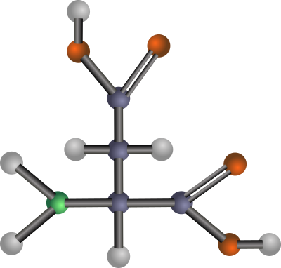 A ball-and-stick model structure of acidic (negatively-charged) amino acid aspartic acid (Asp, D). Carbon in blue-grey, oxygen in red, nitrogen in green, hydrogen in silver. Drawn in Inkscape.