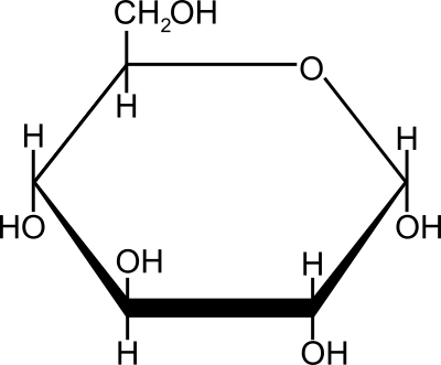 The structure (abbreviated) of the hexose sugar alpha-glucose. Drawn in Inkscape.